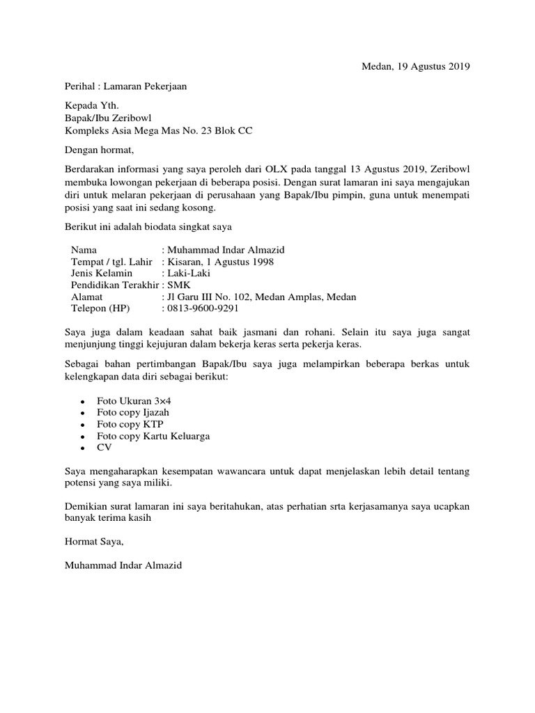 Contoh surat lamaran kerja dalam bahasa inggris i. Tuliskan juga nilai apa yang anda miliki dan yang dibutuhkan oleh pt agar hrd berfikir anda cocok untuk mengisi posisi kosong tersebut. Saya akan memberikan contoh surat lamaran kerja yang baik dan benar + disukai hrd. Dapat anda lihat bahwasanya di dalam contoh surat lamaran tersebut telah dicantumkan beberapa berkas berupa pas foto terbaru berlatar belakang merah 3 x 4 sejumlah 2 lembar, fotocopy ktp, fotocopy ijazah. Atas perhatian bapak/ibu pimpinan, saya ucapkan terima kasih. Hari ini kembali share kan contoh surat lamaran kerja yang baik dan benar. Jika kamu mencari contoh surat lamaran kerja yang baik dan benar, tentu kamu akan menyadari bahwa semua surat lamaran kerja tersebut. Contoh surat lamaran kerja di perusahaan umum ii. Surat lamaran merupakan surat permohonan yang dibuat oleh para pelamar pekerjaan atau pencari kerja, kemudian dikirimkan terhadap suatu. Meskipun pada hakikatnya hanya sebagai jalan rezeki dari tuhan. Jika anda membutukan contoh surat lamaran kerja umum, anda bisa coba baca beberapa referensi yang telah kami buat dari text dan dengan gambar. Dan ini adalah contoh yang ketiga, tutorial membuat surat lamaran kerja yang. Surat lamaran kerja merupakan salah satu syarat untuk mendapatkan pekerjaan yang ingin anda dapatkan.